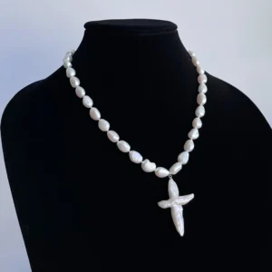 The Freshwater Pearl Cross Necklace brings together classic religious symbolism with modern aesthetics. The cross, once seen only as a sacred emblem, has evolved into a universal symbol of hope, strength, and love. The addition of freshwater pearls introduces softness and sophistication, transforming a simple accessory into a deeply meaningful adornment.